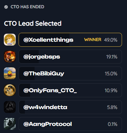 Holders cast their ANON votes to elect the first ever community CTO on the Anoncoin launchpad, proving Kimchi isn’t just meme hype — it’s organized leadership. @Xcellentthings took 49% of the vote to lead the treasury strategy, making meme-coin history.
