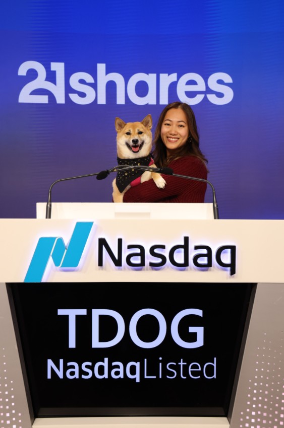 Meet Kimchi, our #ChooseMyShibe winner, and her human @peekabooxp. They joined House of Doge at the @NasdaqExchange to celebrate the Dogecoin ETF with @21shares_us.